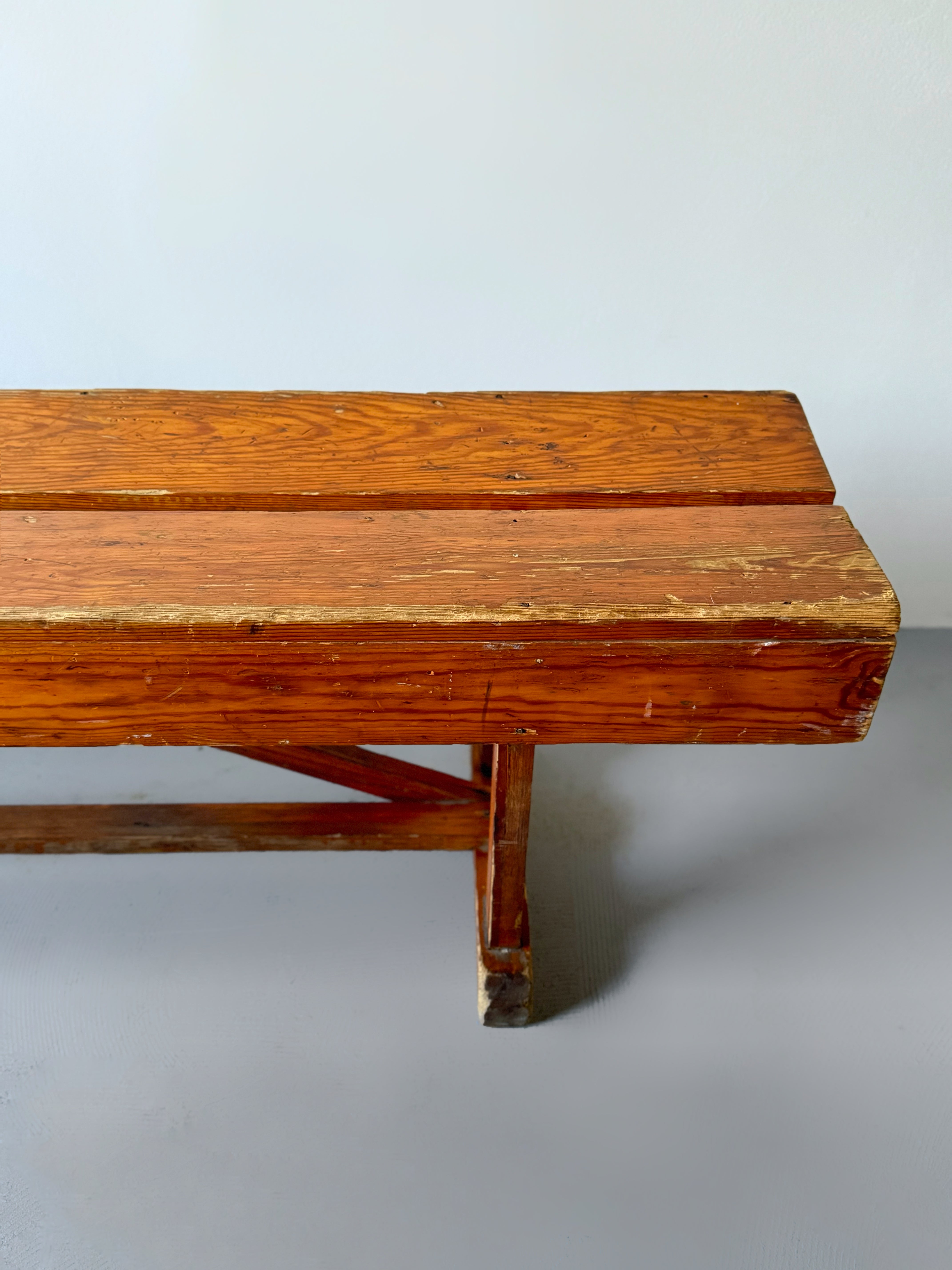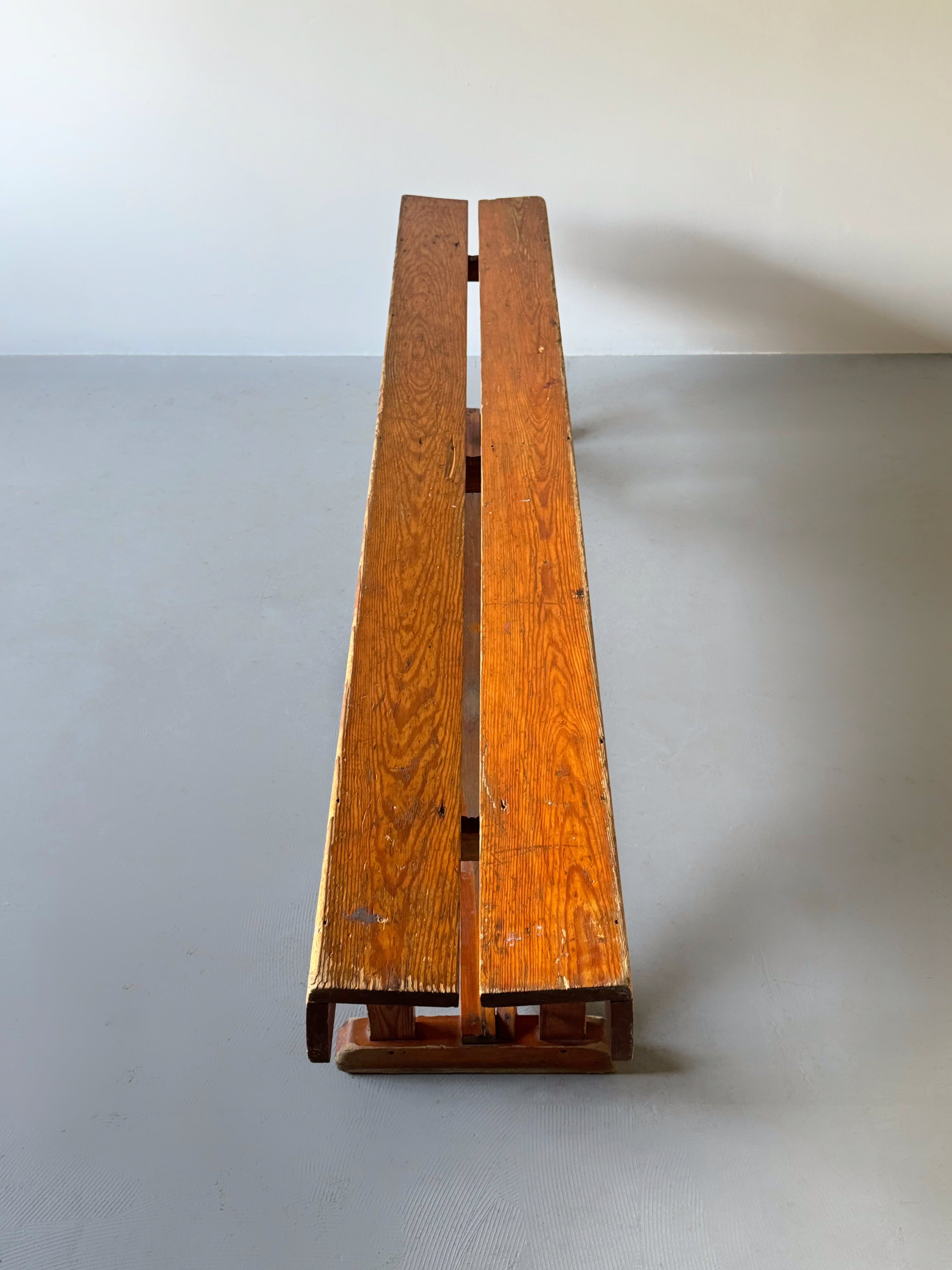 こちらは、建築的な構造をそのまま意匠とした、1950年代に製造された特徴あるベンチです。厚い無垢材を天板とし、断面に独特の造形的リズムを生み出しています。その下を支える支柱と貫の構成は、まるで小さな橋梁やトラスのようにも見え、機能と美が完全に融合しています。無装飾の中に、素材と力学の趣が宿っています。また、オークの木肌が長年の使用で存分に光を帯び、経年の記憶を静かに語りかけてきます。空間に置かれると、家具でありながら建築的な存在感を放ち、まるで一本の軸のように場を作り上げます。無名の職人によるものですが、その思想には確かな造形の倫理が感じられます。