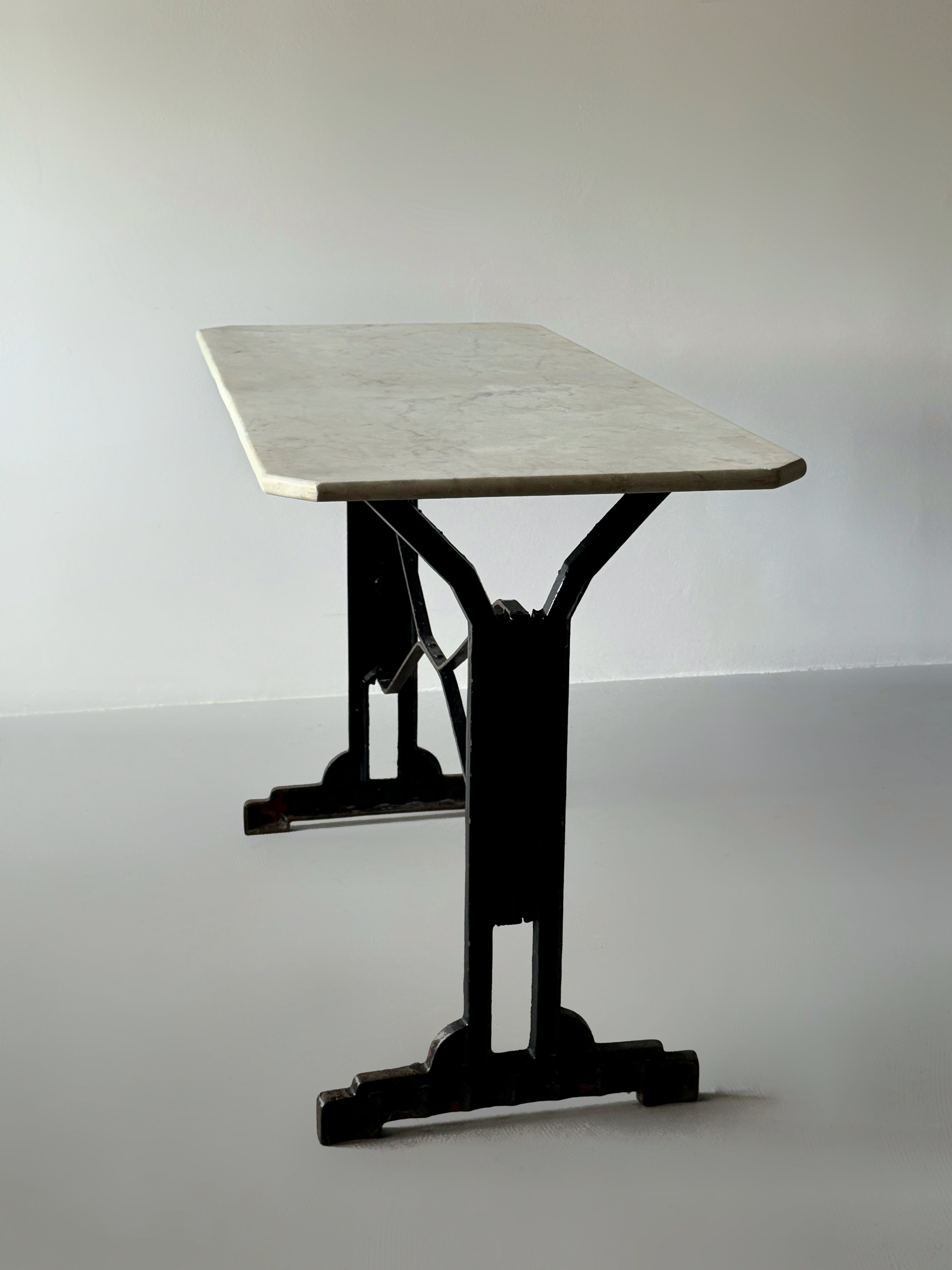 1930年代にフランスで製造された大変希少なルイ・ヴィトンのアールデコテーブルです。脚の内側中央にルイ・ヴィトンのロゴが入ったモデルです。(「LV 」の刻印があります。)当時"世界最高級の旅"と注目を集めたオリエント・エクスプレスのビストロ用にとデザインされた作品です。洗練されたルイ・ヴィトンが持つ旅の伝統を優雅に表現しています。また、オリジナル塗装の鋳鉄製フレームに宿る美は威風堂々としています。