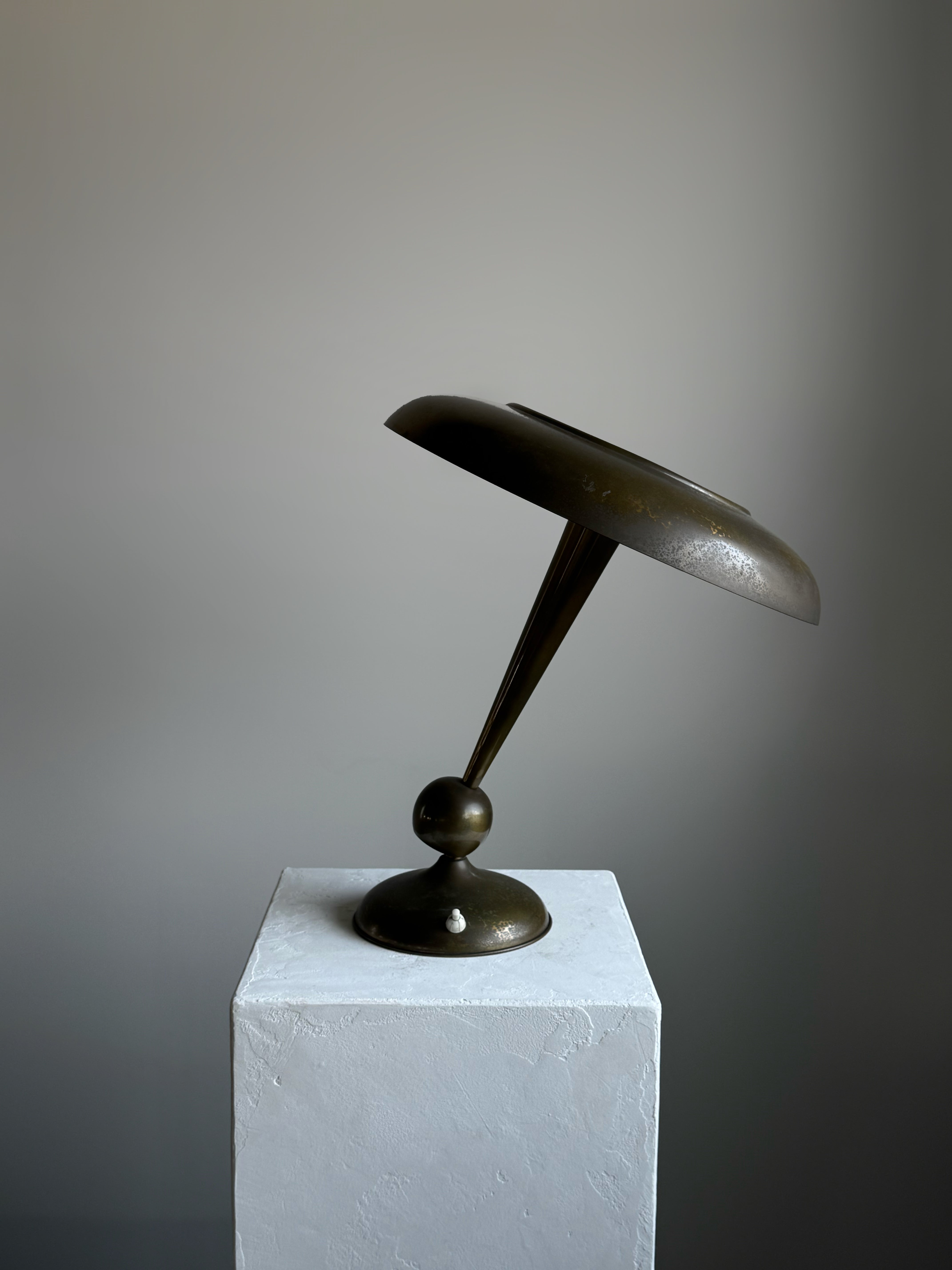 真鍮とガラスによって生まれた造形美、こちらの作品は偉才を放つイタリア出身の照明デザイナー「オスカー・トラスコ」によって1950年代にデザインされた希少作品です。製造は”実用芸術”を目指したLumi社が担いました。Lumi社は戦後の復興期における機能と芸術の統合を象徴する照明メーカーで、非常に知的な作品を製造していました。こちらの照明においても、球体ジョイント部をヒンジにした独特の可動構造がまさに芸術的、想いのままに傾斜する支柱の仕組みなど発想が見事です。また、長い年月により真鍮が美の層を奏でる様子も素敵です。トラスコデザインの卓越した経年美をご堪能ください。