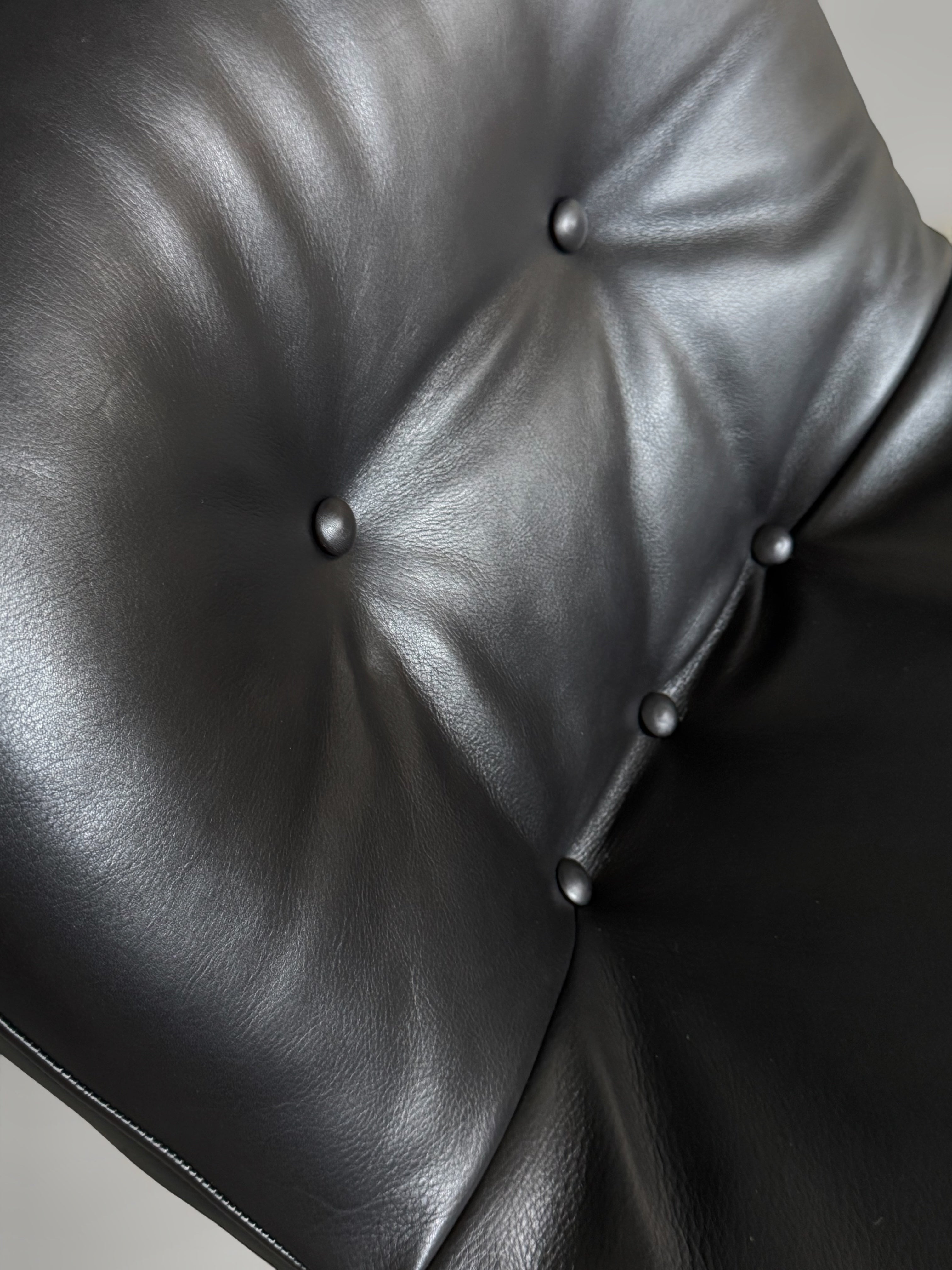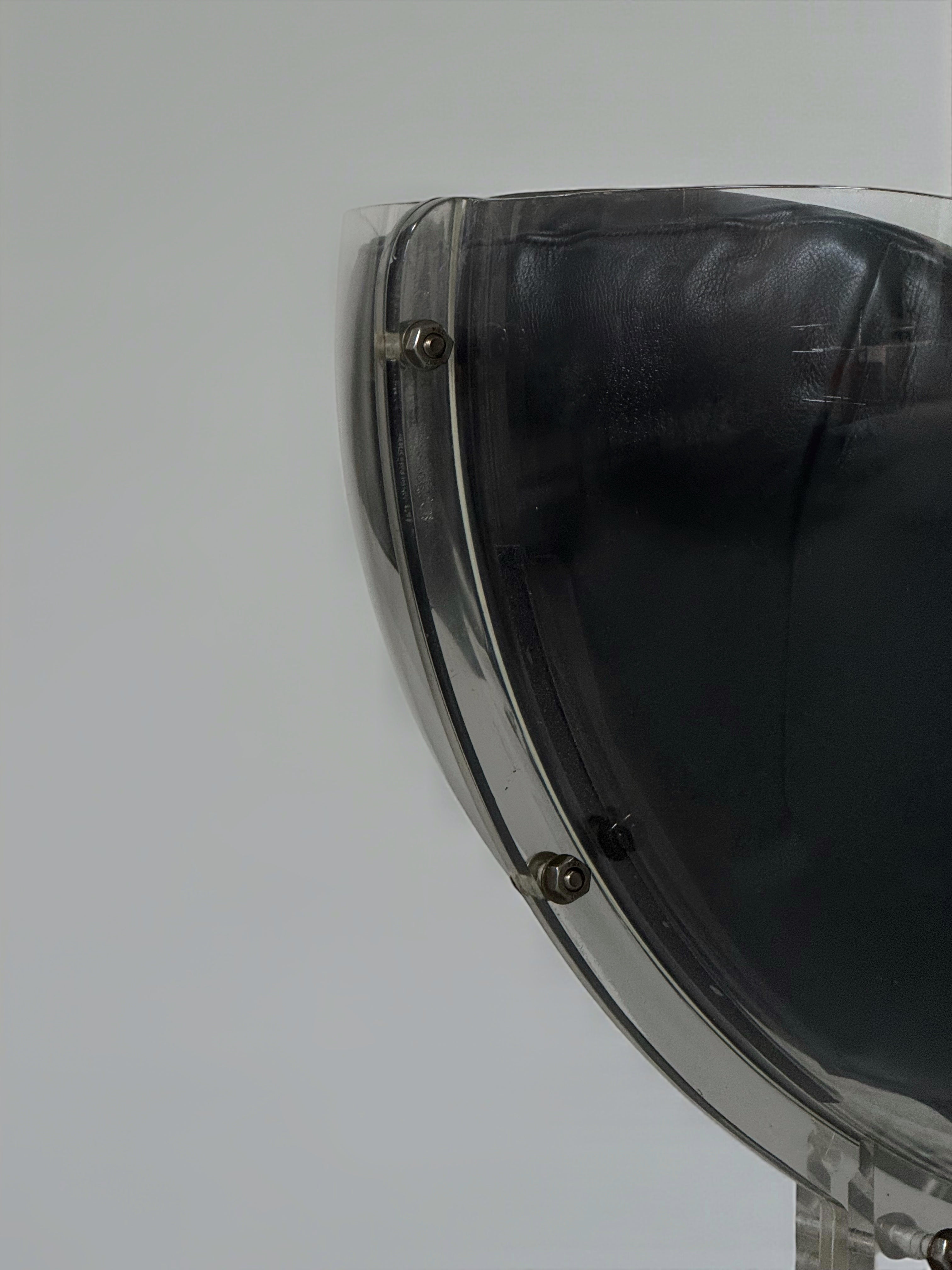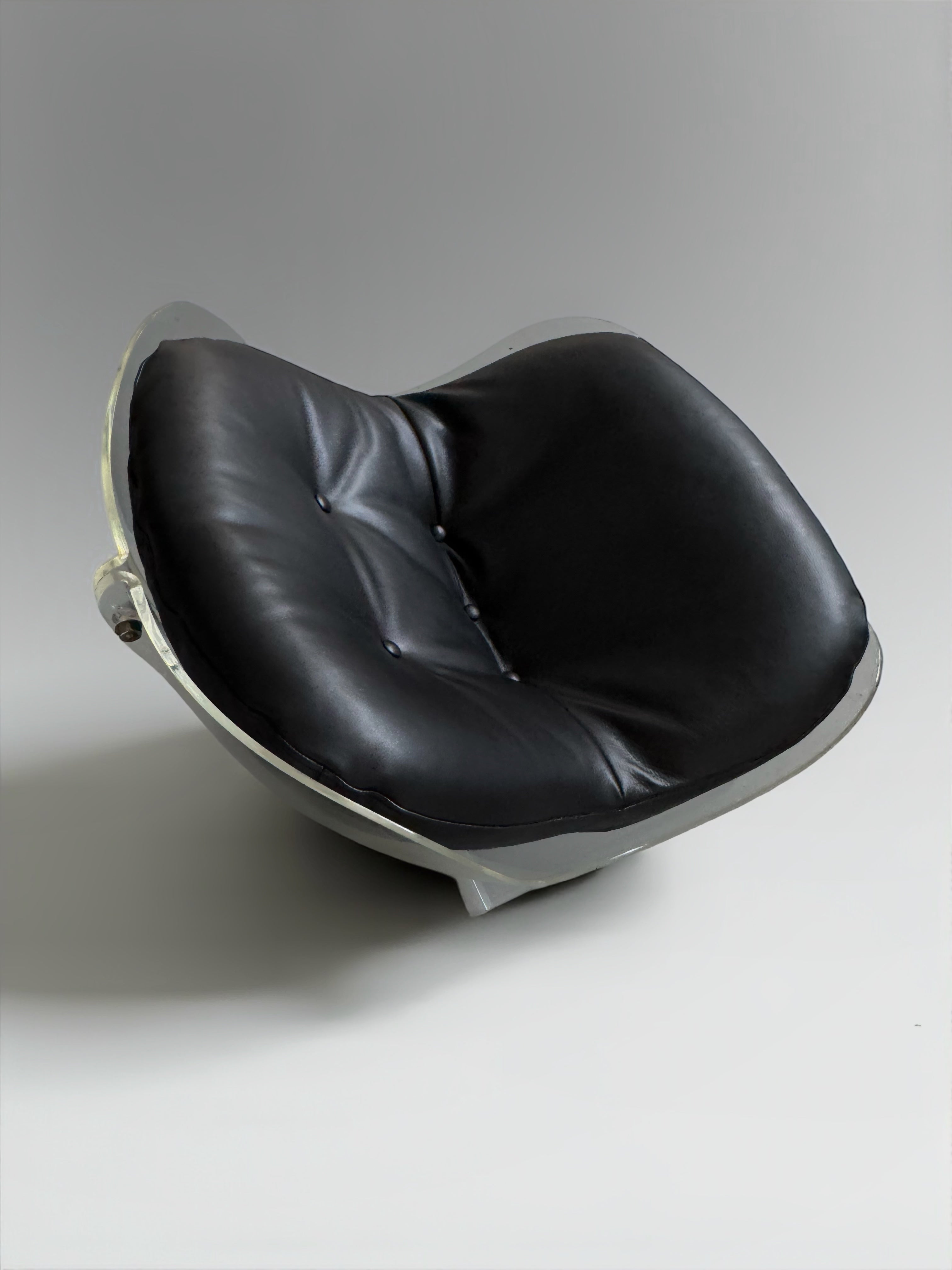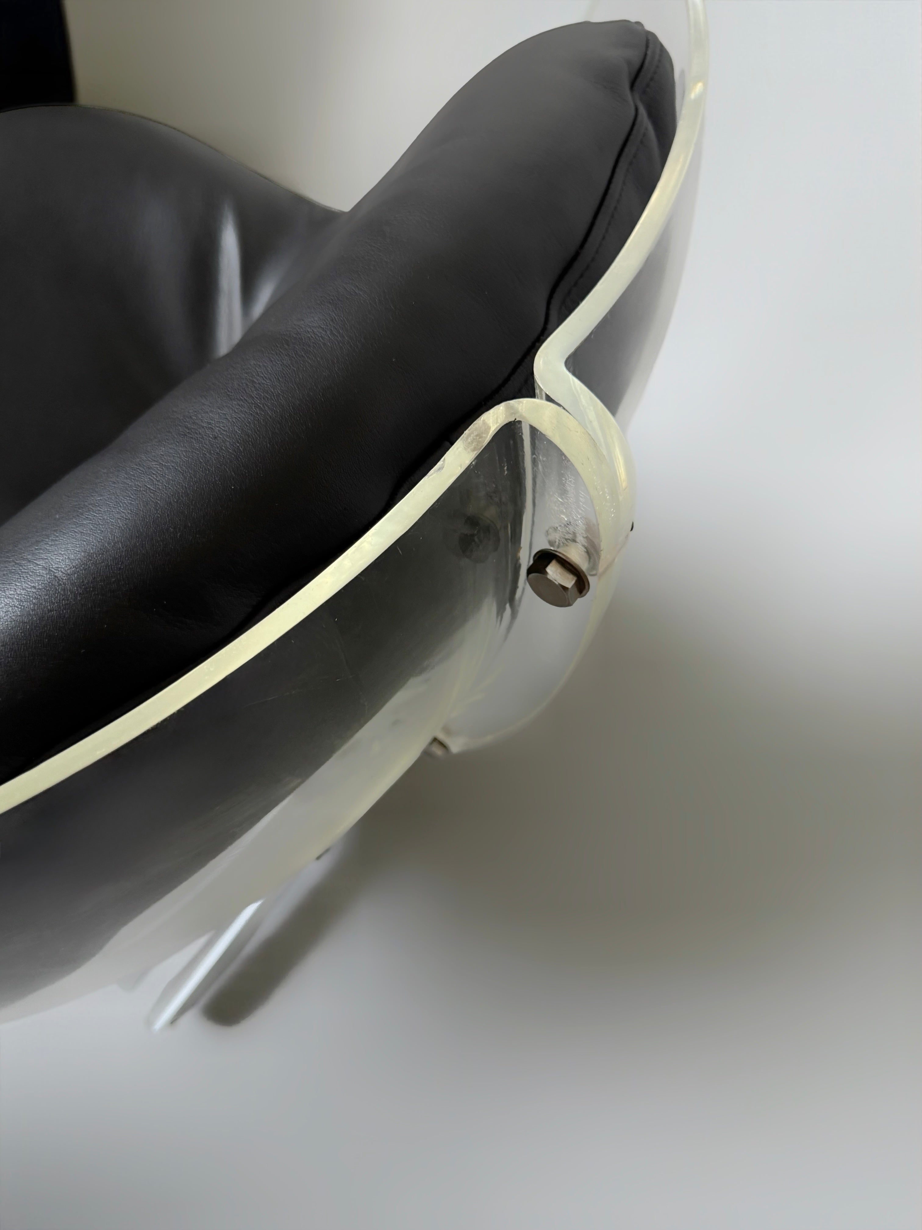 こちらは、フランス人デザイナー「ボリス・タバコフ」によってデザインされた「Sphere Armchair」です。1970年前後にMMM社が製造を担いました。透明なアクリルを主要とし、浮遊感を演出する独自の構造が、空間に“浮遊する座”を生み出します。1960〜70年代にかけてヨーロッパで発展した“スペースエイジ・デザイン”は、まさに「見えないものの形」を追い求めた時代、タバコフは一時代の夢を具現化した傑作をこのシリーズに託しました。目を奪う硬質素材と透明素材の融合が卓越しており、宙に浮くように曲線を描きながら、内側のクッションを包み込みます。ベース部分の幾何学的な構造も秀逸で、タバコフ特有の「重力を視覚的に裏切る造形」が際立っています。座るための椅子というよりは、「未来への夢を形にした球体」と言えそうです。時代を超えてもなお、実験的で特別な緊張感を放つ逸品です。