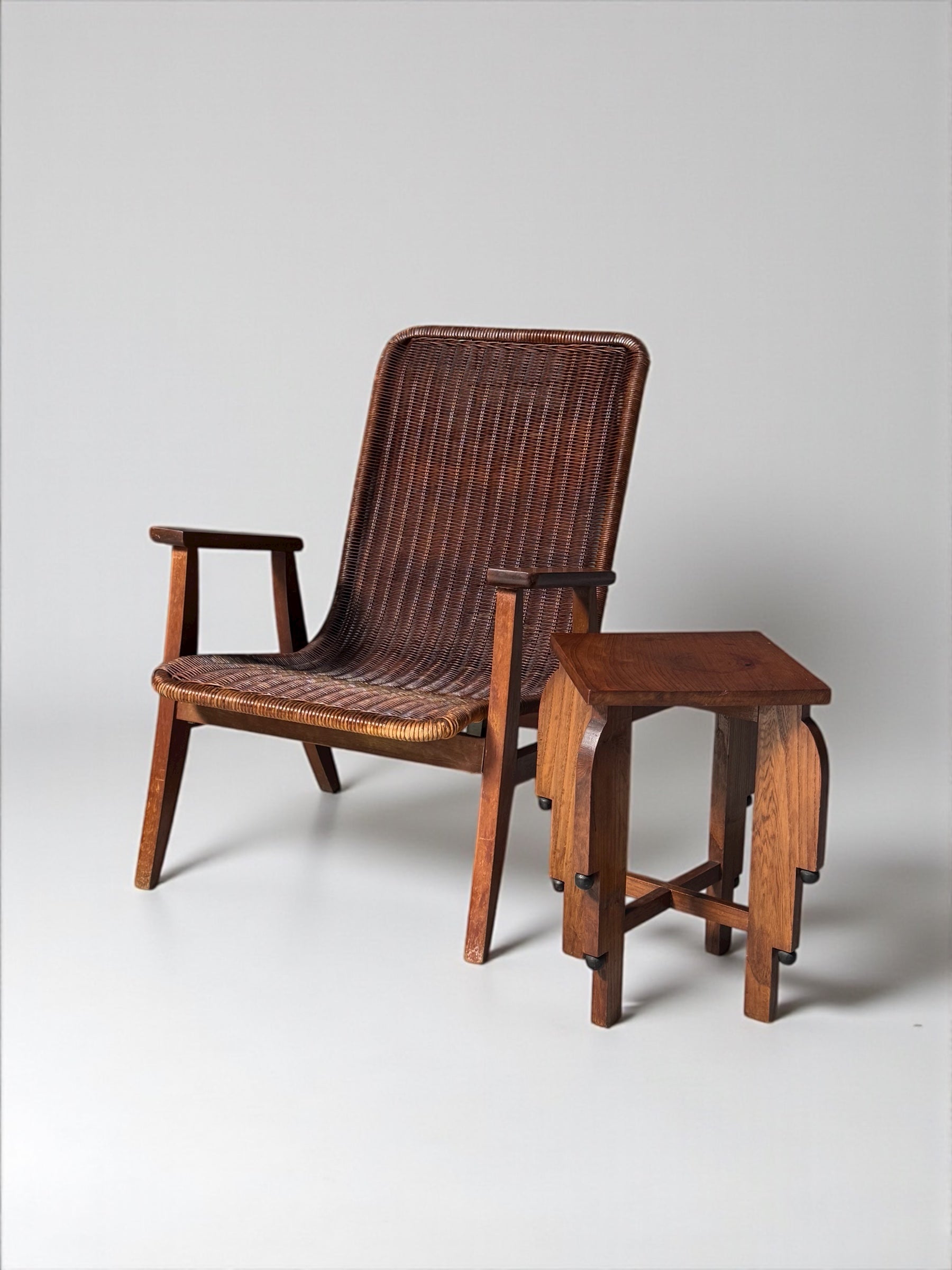 力強くも軽やか、構造と装飾が交差する美しいサイドテーブルです。アール・デコ後期の香りを漂わせるこちらの作品は、均整の取れた直線と、脚部に施された装飾的意匠が独特の雰囲気を生み出しています。"多脚"に見える四辺の構成が見事で、影が本体に寄り添うように重なり合うフォルムは見応えがあります。また、視点によって変化する陰影と奥行きの演出も魅力的、空間の重心をそっと整えるような艶と深みの上品さを持ち合わせています。美しいバランスを纏った一台です。