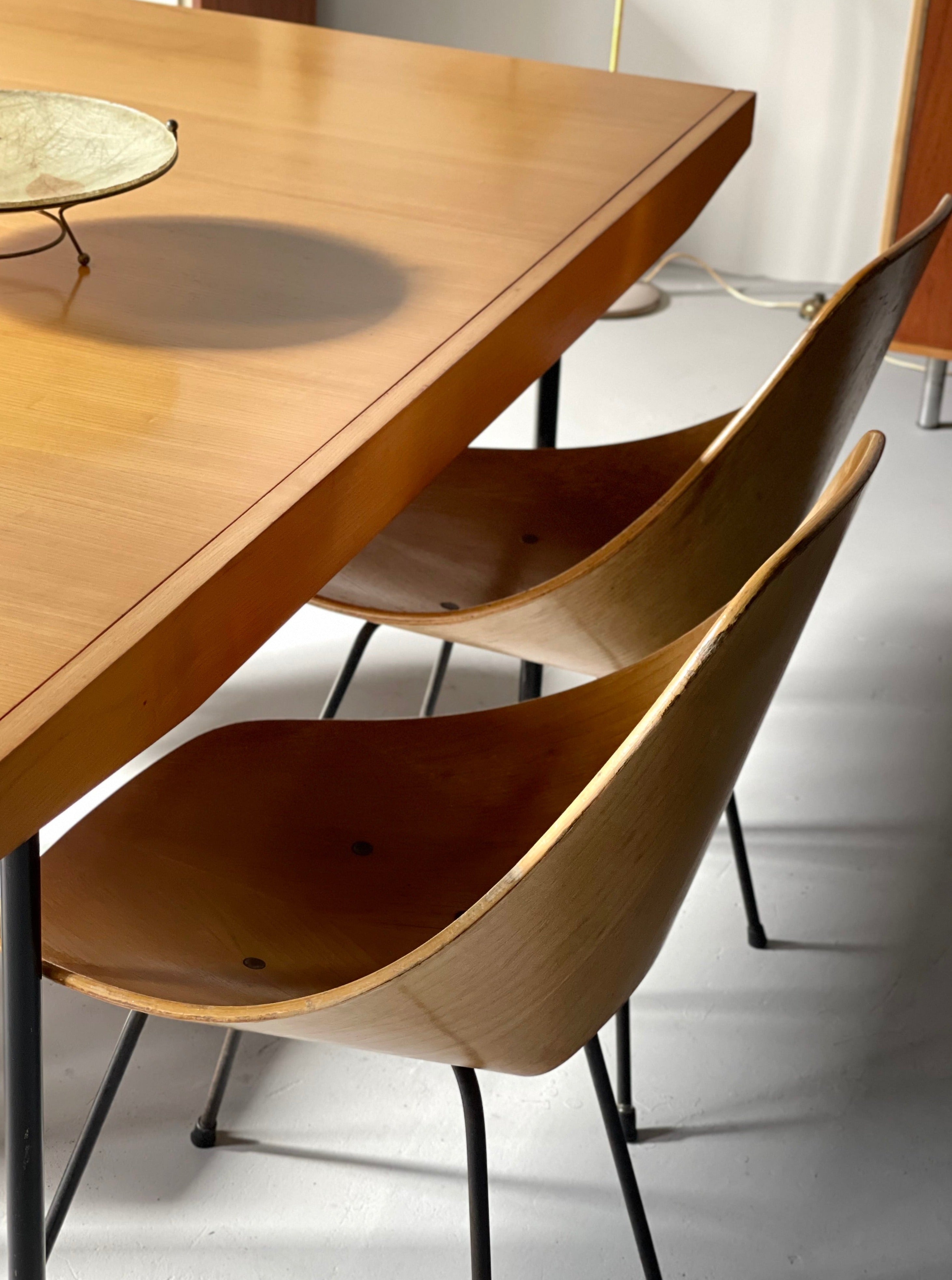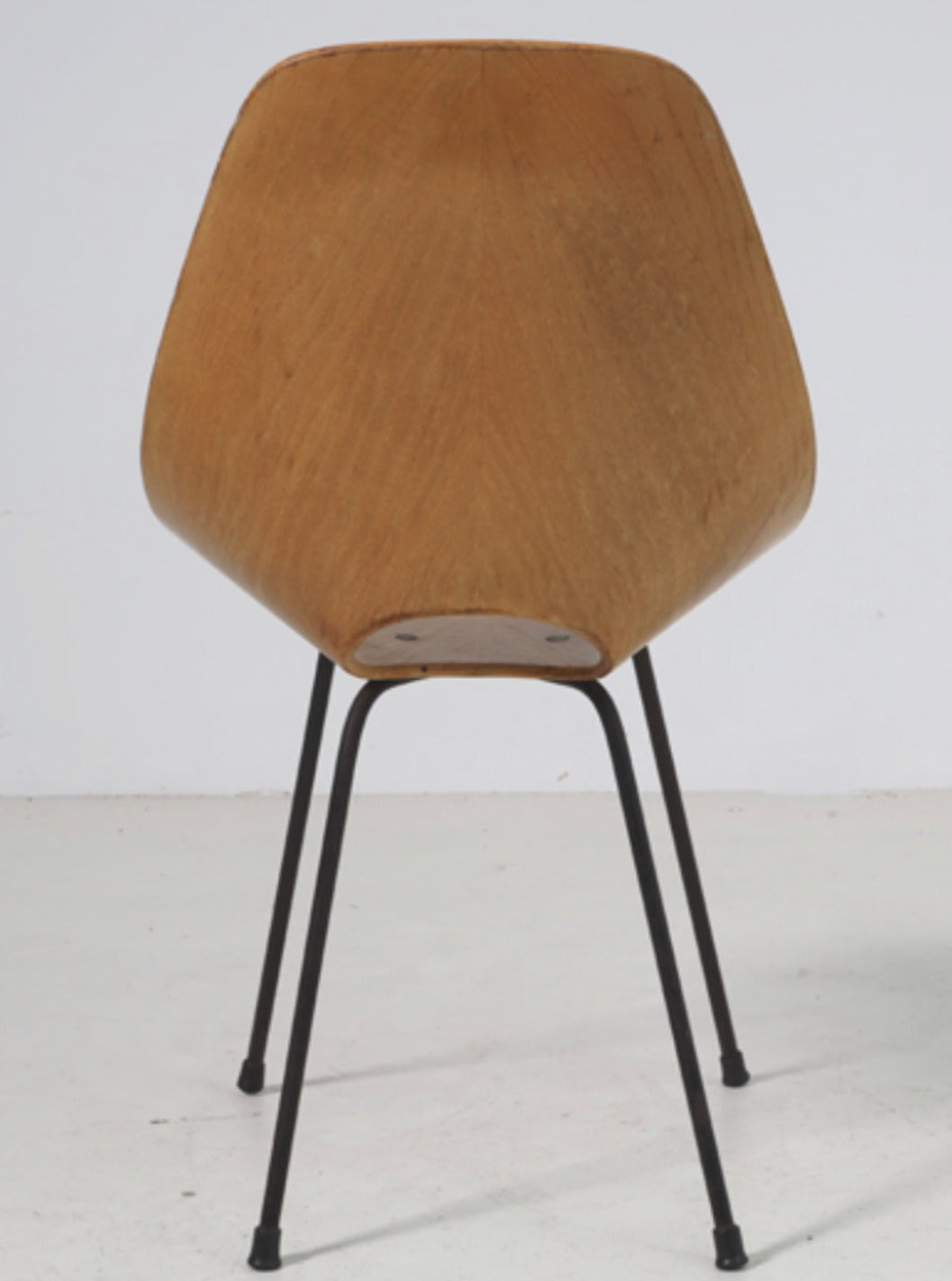 1955年、家具メーカー「Tagliabue」のため に、イタリアのデザイナー「ヴィットリオ・ノビリ」がデザインを手がけたメディアチェアです。合板には耐久性のある良質なアッシュ材が用いられており、美しい杢目と共にしなやかさが活かされています。シンプルな形状をここまで個性的にするノビリのセンスに圧巻です。製造された翌年1956年には工業デザイン賞「コンパッソ・ドーロ」を受賞しています。(4脚セット)コンディション詳細・在庫確認・送料に関しましてはinfo@swankysystems.jpまでお気軽にお問い合わせください。